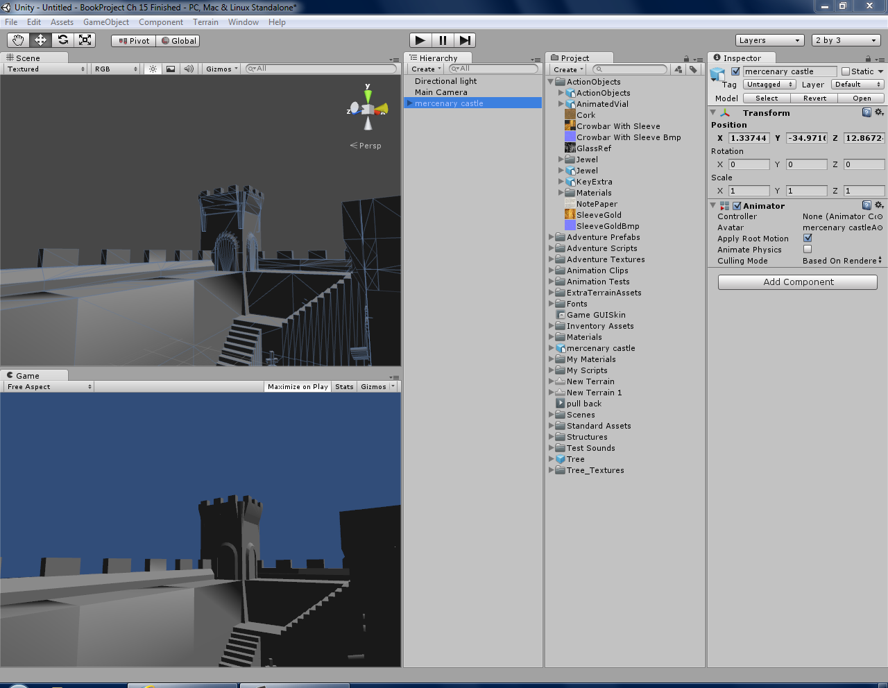 Now I’m not naive enough to believe that Unity is going to write my game for me but I do think it is likely to make me more productive and so far I’m having fun using it which is why I started doing this in the first place. I’ll still have to write lots of code (in javascipt, C# or Boo) but there are thousands of examples online and it all appears to be well documented and a lot of the core game functionality can be handled through game objects or properties. So far it’s been a pleasant environment to work in. So far I’ve had an on screen graphical inventory up, a menu system and and my own mountains and wilderness to explore created in very little time. I think once I’ve got a better grip on the basics I believe I’ll be able to make much more rapid progress.